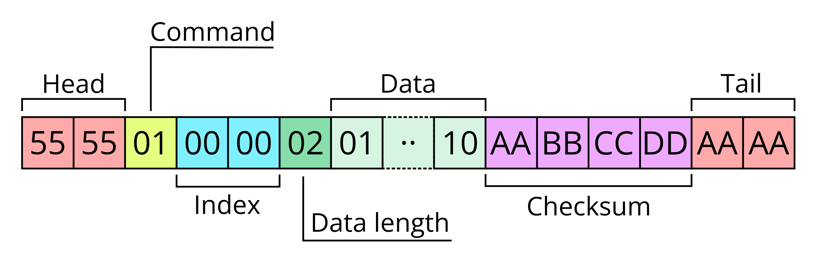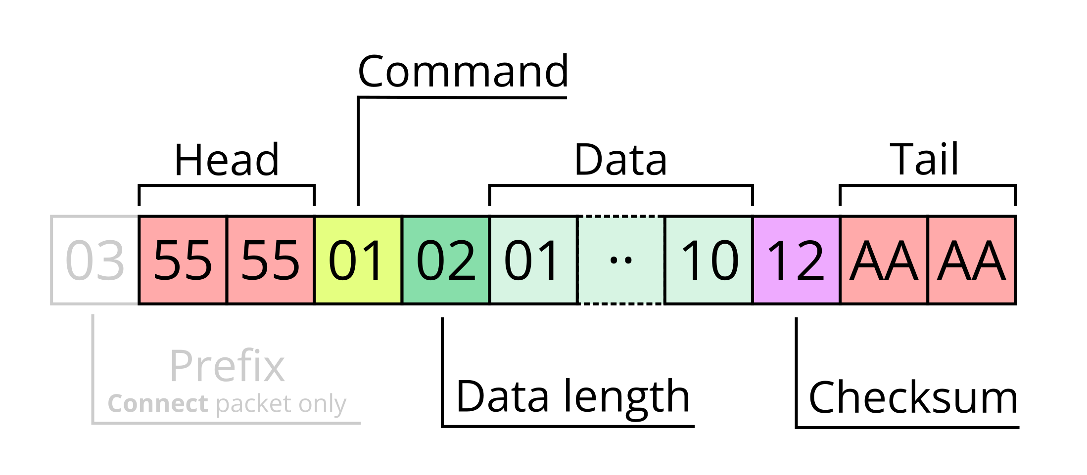 - Checksum - calculated by XOR of all bytes from Command to the last byte of Data (inclusive).